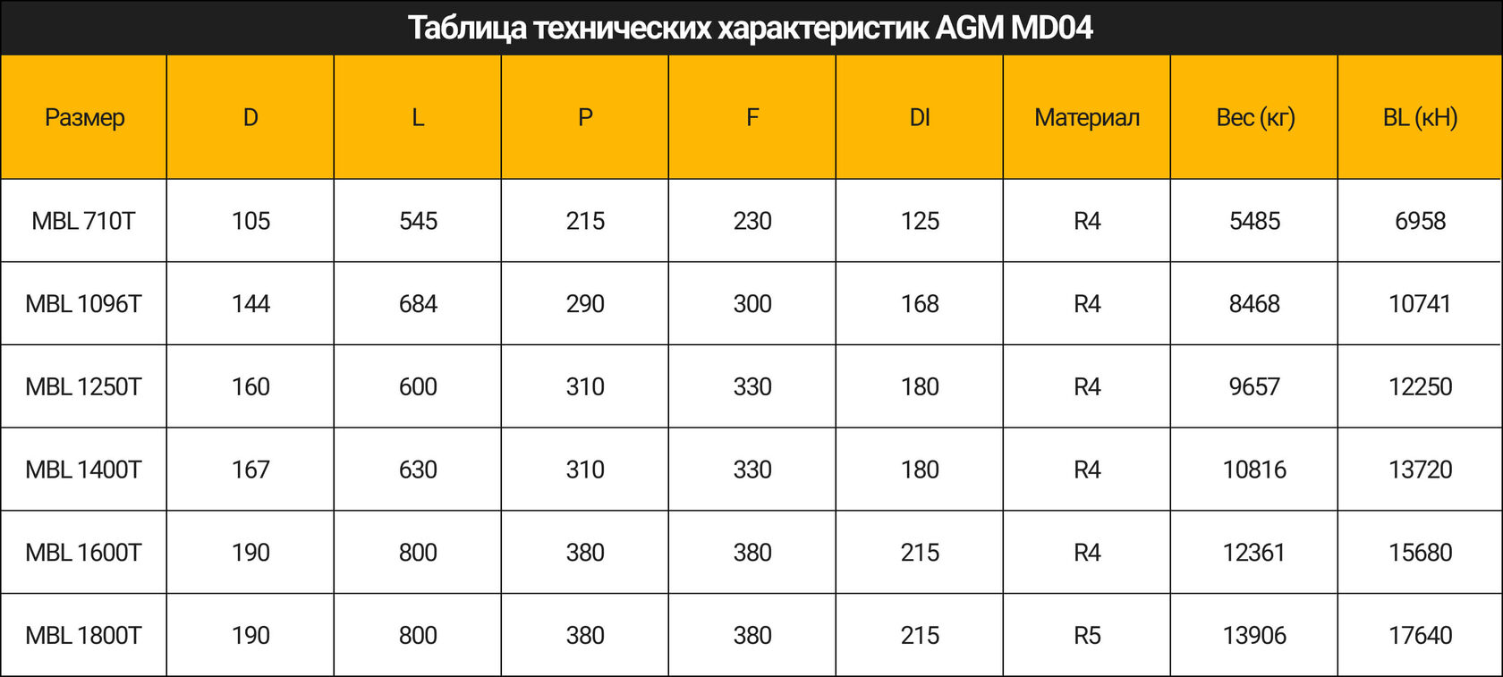 Концевая ( якорная) скоба тип AGM MD01 Предназначена для соединения элементов якорной цепи, а так же для присоединения якорной смычки к якорю Соединительная скоба тип AGM MD02 Предназначена для соединения отдельных элементов якорной цепи между собой, обеспечивая надежную фиксацию и передачу нагрузки в цепной линии. Концевая соединительная скоба тип AGM MD03 Предназначена для соединения якорной цепи с конечными элементами системы (например, вертлюгами или переходными звеньями), обеспечивая прочное и безопасное крепление на концах цепи. Скоба канатная D-образная тип AGM MD04 Предназначена для соединения канатов, тросов и такелажных элементов, а также для быстрого и надежного крепления грузов в различных подъемных и швартовных операциях.